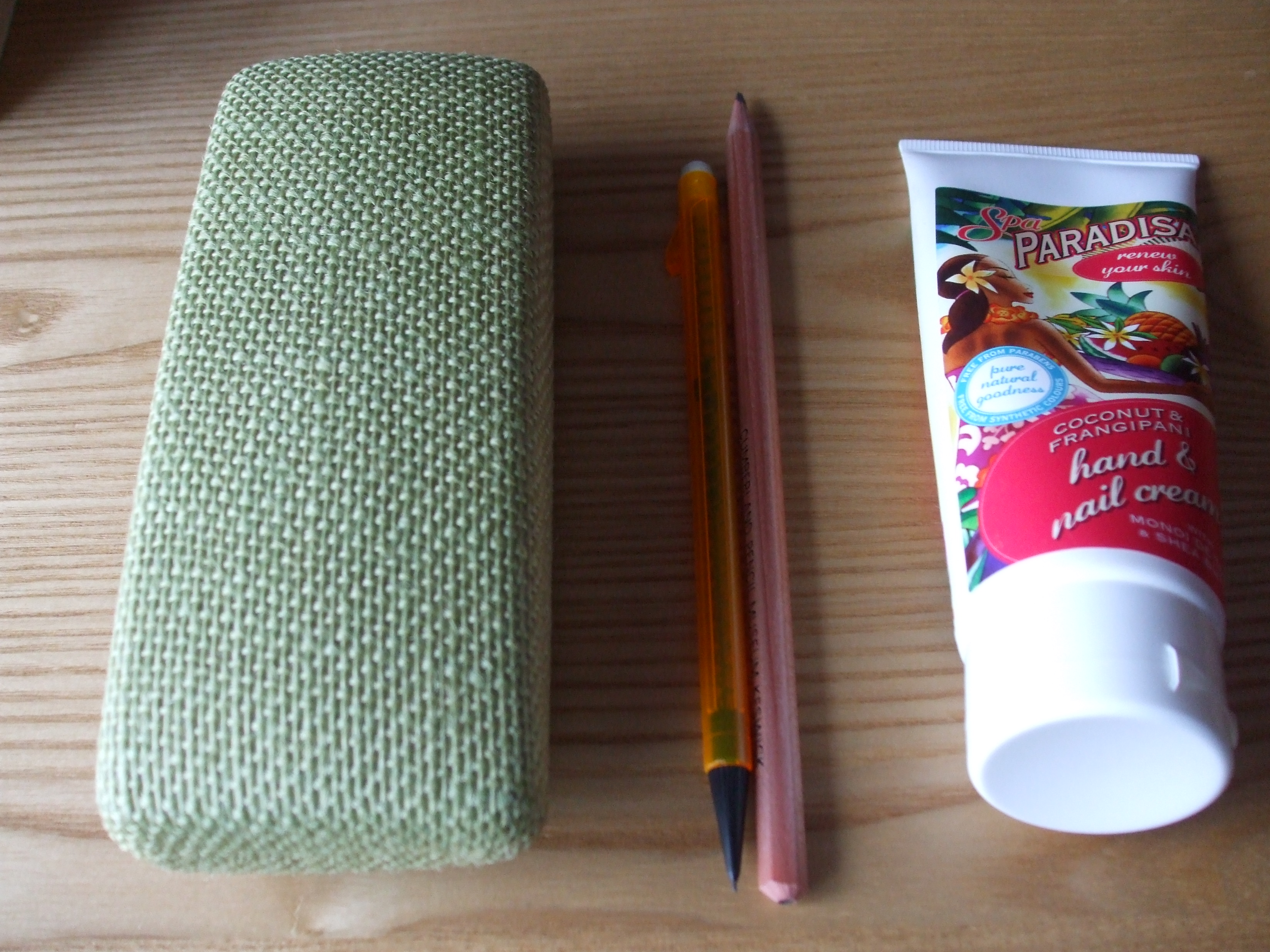 ....... my reading specs - I wear them in the mornings when I read after breakfast (for the rest of the day I wear varifocals), pencils for doing crosswords, keeping track of knitting patterns etc, and handcream ...... I have tubes and bottles of handcream all over the house, as my hands get very dry in the winter.