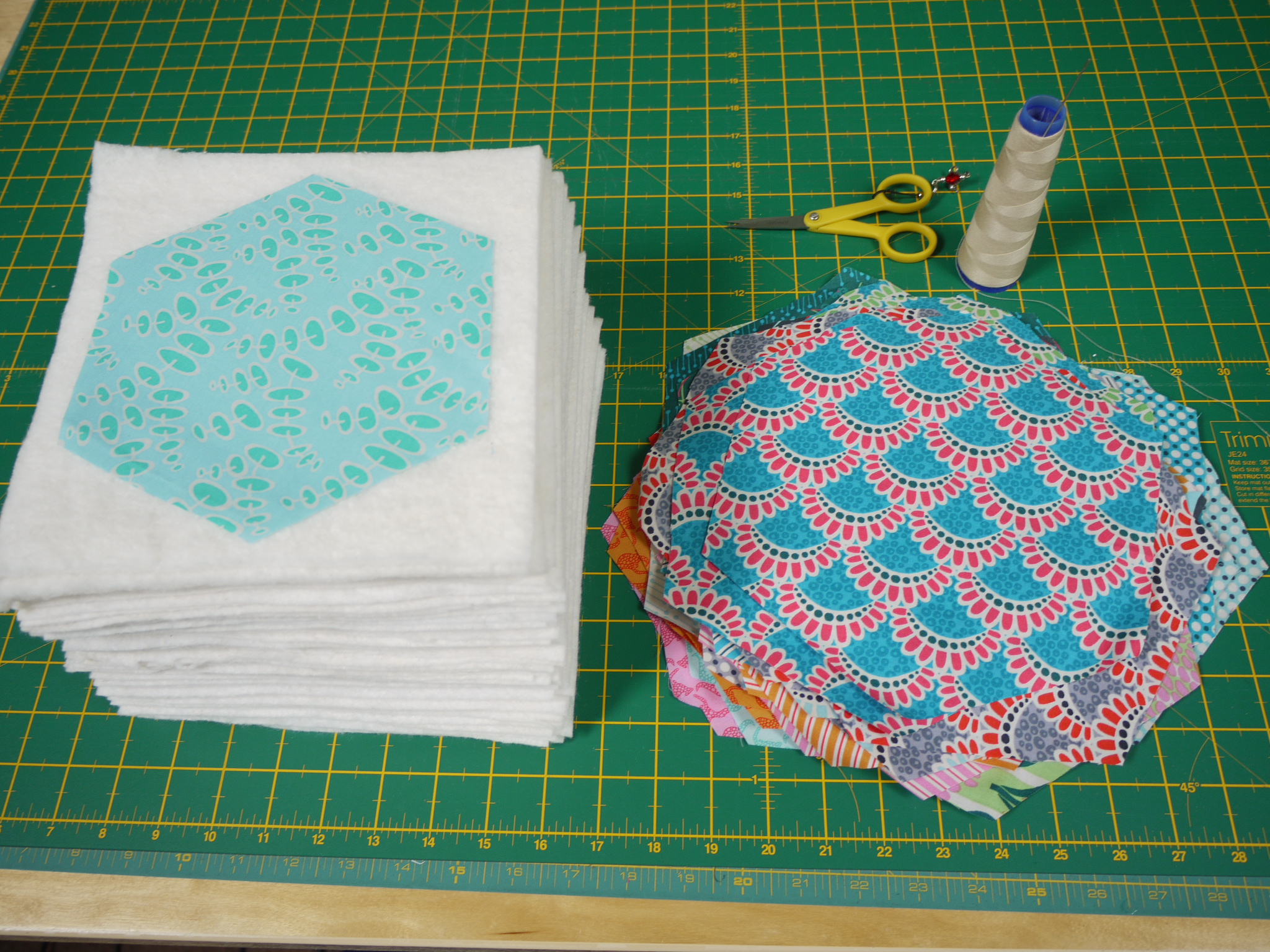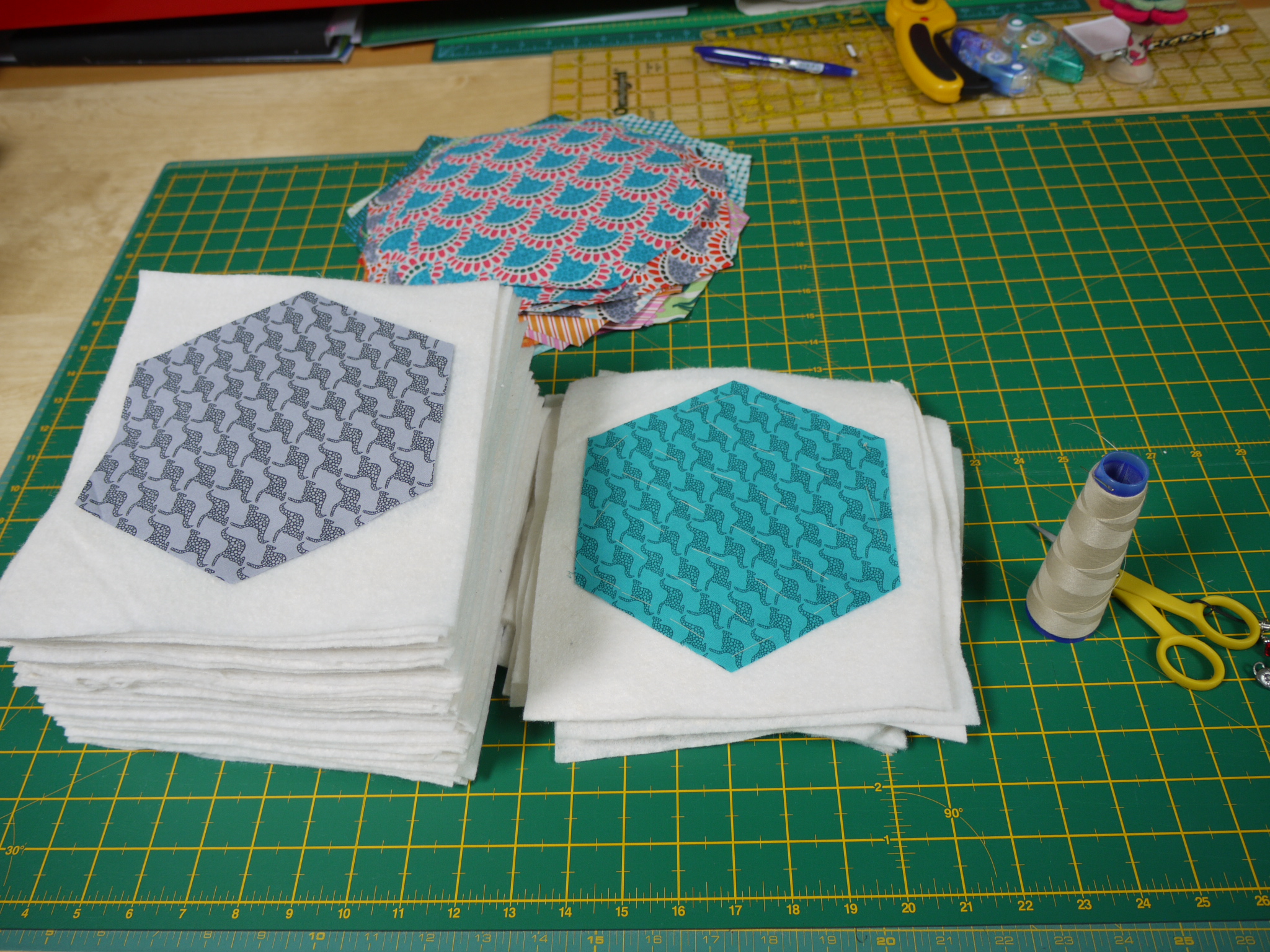 Ros was prepping hexies (and I was delighted to see how well she looked, as she had been in a terrible car accident since I last saw her)